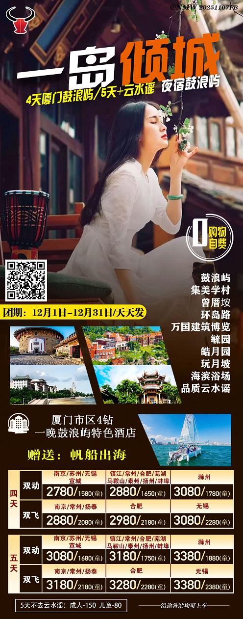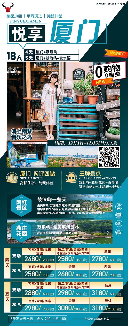 【悦享厦门:厦门鼓浪屿+云水谣4-5日游 0购物0自费 18人小团】.行程