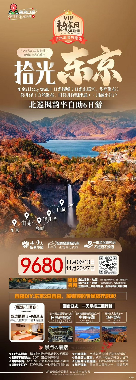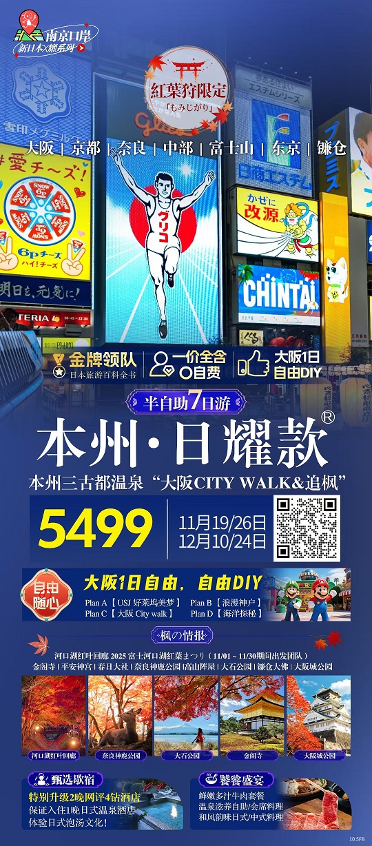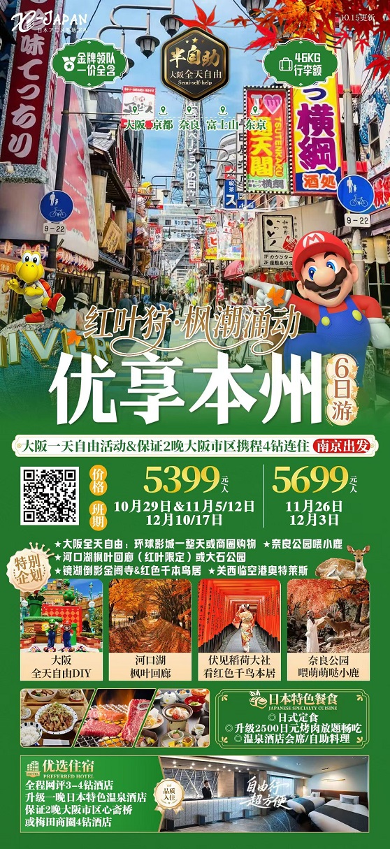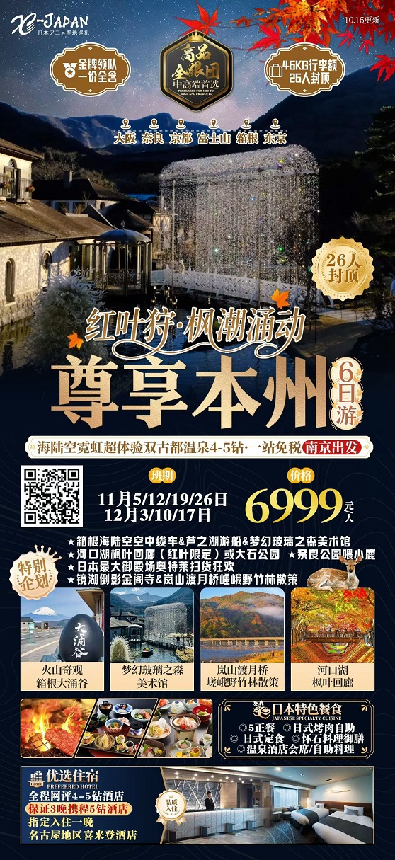 【本州全餐款:日本本州三古都温泉+日本红叶季6日游 升级全含餐】.行程