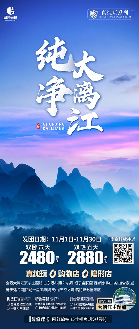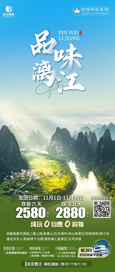 【情寄山水:桂林阳朔双飞5日 4钻泳池酒店 0购物0自费】.行程