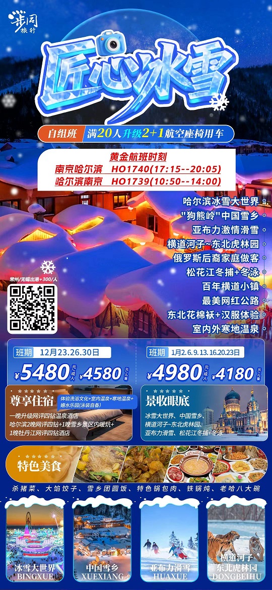 ∠前往【冰雪大世界】(游览约4小时)每年冬季举行,汇天下冰雪艺术之精华、融世界冰雪游乐于一园,场面恢宏壮阔,被誉为“冰雪史诗画卷”。这里有气势磅礴的冰雪景观,尽显宏大之美;这里有悦目剔透的冰雕建筑;这里有流光溢彩的冰雪夜景,浸透自然之美;这里就是以冰为体,以光为魂,打造梦幻之美的—哈尔滨冰雪大世界,在这里可欣赏漂亮的冰雕、雪雕以及冰雪城堡,夜间在各色灯光渲染下的冰灯盛宴更是迷人,还可尽享各种雪地娱乐项目。(冰雪大世界为每年12月20-24日左右开放,如抵达时未开,可赴冰雪大世界室内馆梦幻冰雪馆观看冰灯艺术展。)