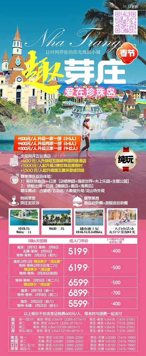 线路名称:春节【越南芽庄-南京直飞】2月7日-2月23日报价