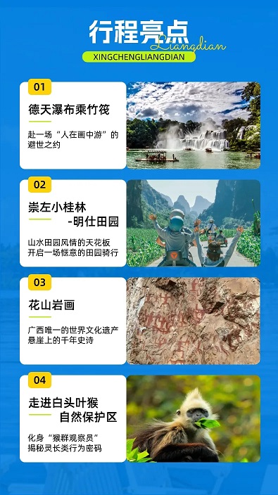 早餐后,乘车前往【白头叶猴自然保护区】(游览约3小时,含景区电瓶车)广西白头叶猴自然保护区是为了保护白头叶猴及其栖息地而设立的自然保护区。白头叶猴是世界珍稀猴种,也是中国特有的灵长类动物,比大熊猫还稀有的石山精灵--白头叶猴,被列为国家一级重点保护野生动物,白头叶猴因头顶毛发呈白色、并以树叶为食而得名,是广西崇左市特有物种,至今已生存 300 多万年,被公认为世界上稀有的猴类,全世界仅有 1000 只左右,崇左市就有 400 多只白头叶猴在此生活,因此被称为“中国白头叶猴之乡”。