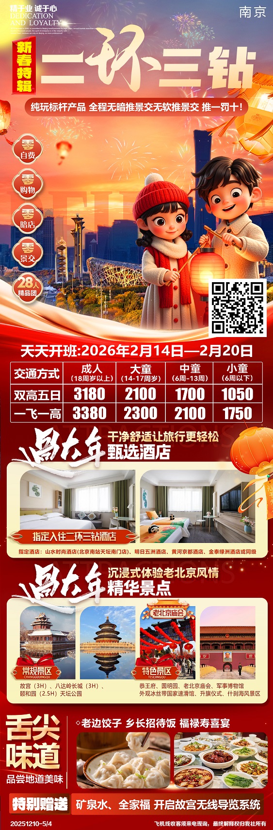 【二环三钻:北京5日游 逛老北京庙会 入住二环三钻酒店 0购物0自费】.行程